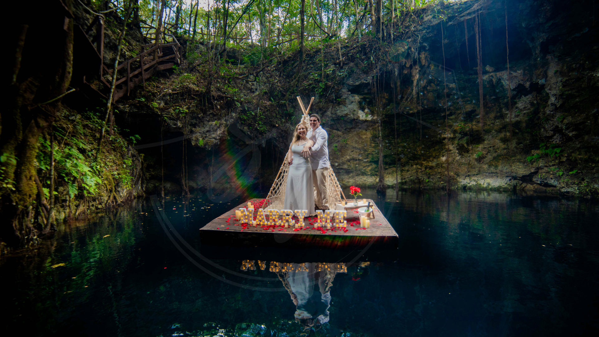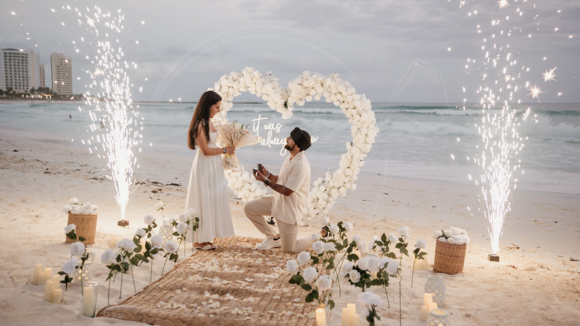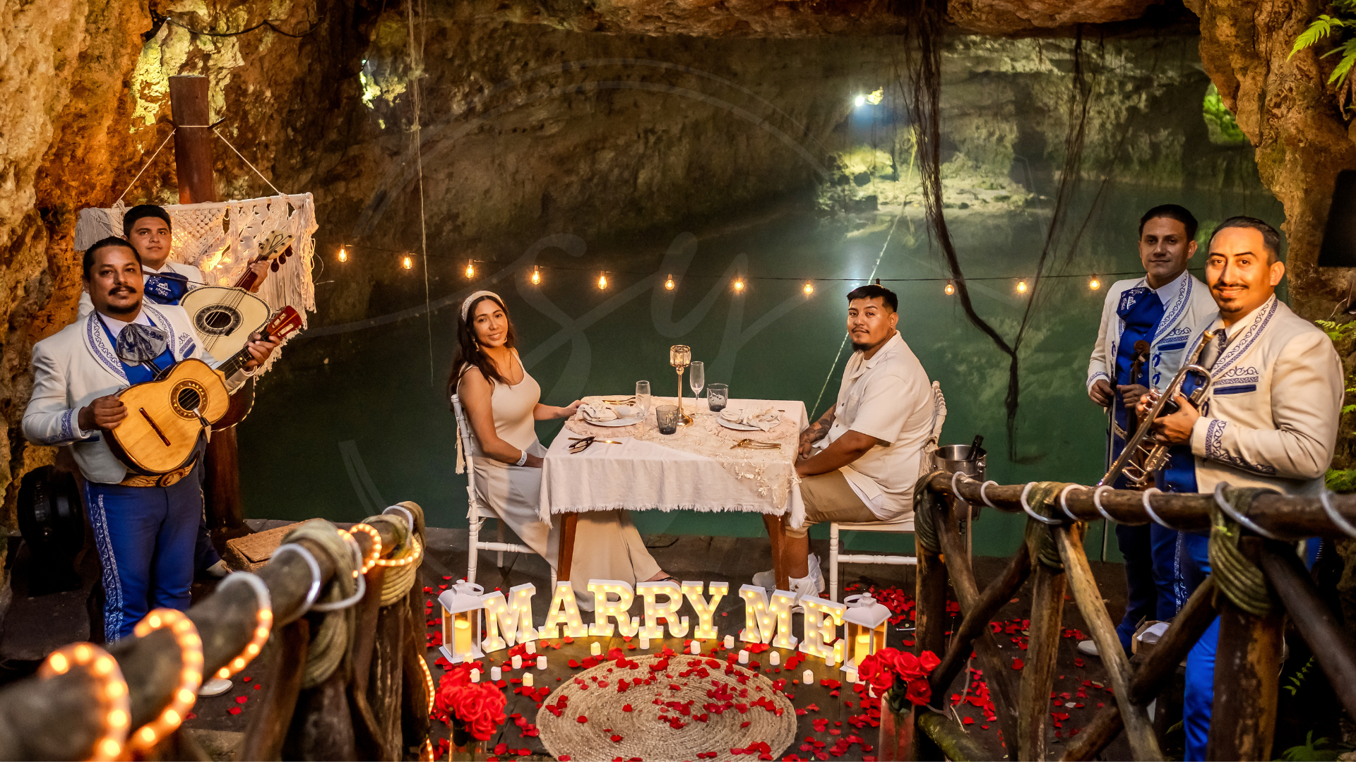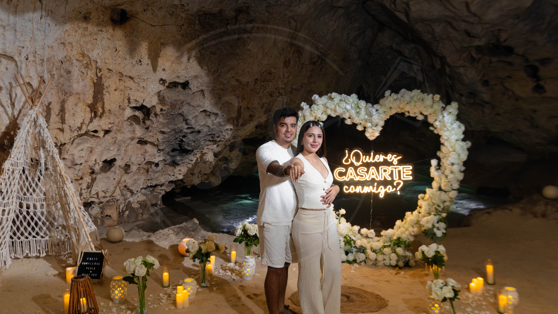 Somos expertos en proposal en los escenarios más hermosos del Caribe Mexicano. Desde una pedida de mano en la playa, un rooftop proposal con vista a la rueda de Cancún, hasta un cenote proposal lleno de magia natural… diseñamos cada detalle para que tu momento sea inolvidable.